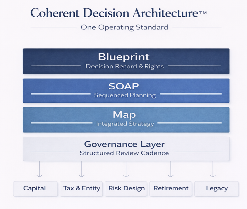 ![]() A decision architecture for complex lives THE ERX SYSTEMGovernance applied through disciplined architecture.The ERX Standard defines the governing principle. The ERX System operationalizes it. This is not a collection of services. It is a structured decision architecture built for physicians, founders, executives, and complex families whose choices carry consequence. Traditional advisory models optimize recommendations. The ERX System governs the environment those recommendations operate within. Tax, investments, estate design, entity structure, and risk are not managed in parallel. They are sequenced within one accountable framework. ![]() ERX BlueprintStructural architecture before execution.The Blueprint establishes decision rights, sequencing priorities, and cross-domain dependencies before capital is deployed or legal structures are executed. Architecture precedes action. ERX SOAPDiagnostic reasoning applied to capital.More than eight years ago, during the formal development of ERX, we refined the discipline used to document and sequence high-consequence financial decisions. My wife — a physical therapist with over two decades of clinical experience in diagnostic documentation — recognized the structure immediately: “You’re operating inside a SOAP framework.” In medicine, SOAP — Subjective, Objective, Assessment, Plan — is cognitive governance. It converts complexity into disciplined action under consequence. That structural alignment was formalized and embedded. For more than eight years, ERX has operated under that diagnostic discipline: Subjective — clarify priorities, constraints, and contextual pressures.Objective — verify structural, financial, tax, legal, and entity realities.Assessment — isolate systemic drivers and second-order implications.Plan — sequence execution with defined ownership and documented accountability. SOAP ensures decisions are governed before they are executed. ERX MapIntegrated visibility across domains. Fragmentation hides in the seams. The ERX Map aligns tax posture, investment strategy, estate architecture, entity structure, and risk oversight into one coherent system — exposing dependencies before they become liabilities. Integration is protective. ERX GovernanceOngoing orchestration and structural continuity. Structure without governance degrades. Governance preserves coherence as inputs shift, specialists evolve, and complexity scales. Execution remains intentional.Accountability remains defined. Why This System Matters NowAI will compress production. Plans, projections, allocation models, and documentation can be generated instantly. Production becomes abundant.Governance remains scarce. The differentiator is no longer who can produce output —it is who can govern the full decision architecture under complexity. The ERX System was built for that hierarchy. Architecture endures when output becomes commodity. |